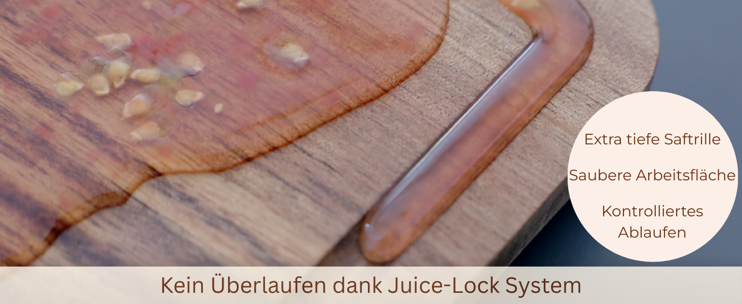 Das innovative Juice-Lock System mit extra tiefer Saftrille und praktischer Ablaufschräge hält Flüssigkeiten zuverlässig zurück - für saubere Arbeitsflächen und müheloses Zubereiten.