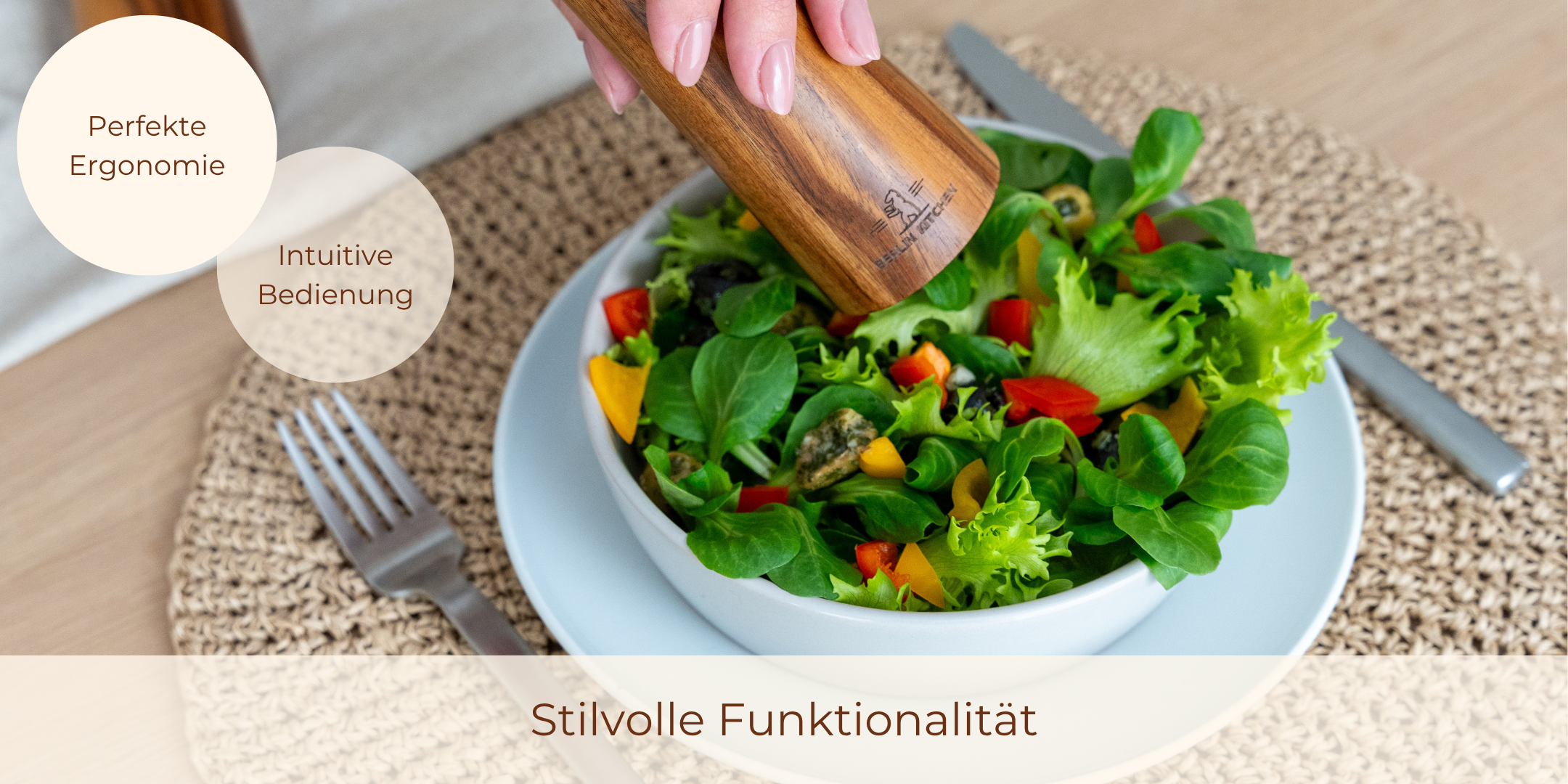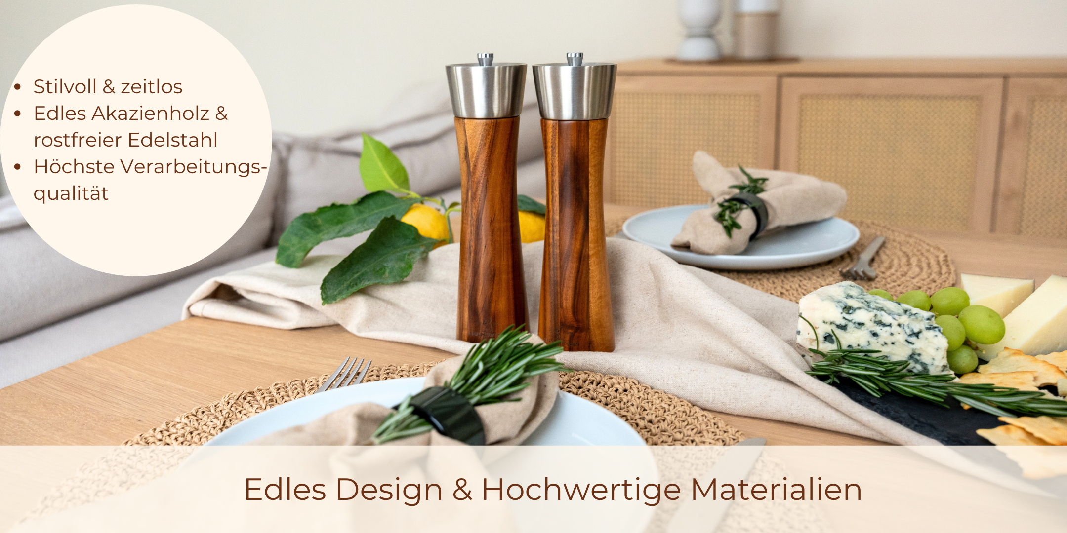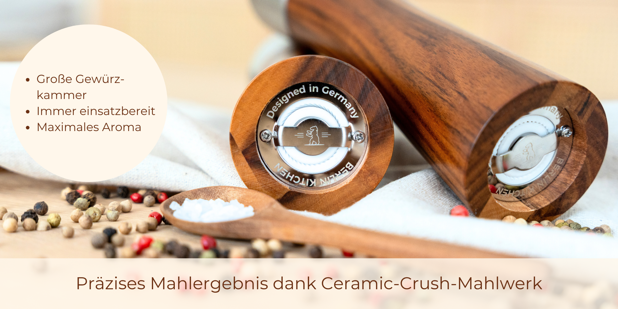 Das Ceramic-Crush Mahlwerk sorgt für maximales Aroma, ist geschmacksneutral, korrosionsbeständig und dank Krümelschutz bleiben Oberflächen sauber. Die Kombination aus feuchtigkeitsbeständigem Akazienholz & Edelstahl macht die Mühlen ergonomisch, langlebig & nachhaltig. Die große Gewürzkammer reduziert Nachfüllintervalle, während die geschlossene Holzkammer das Aroma bewahrt und vor UV-Strahlen schützt.